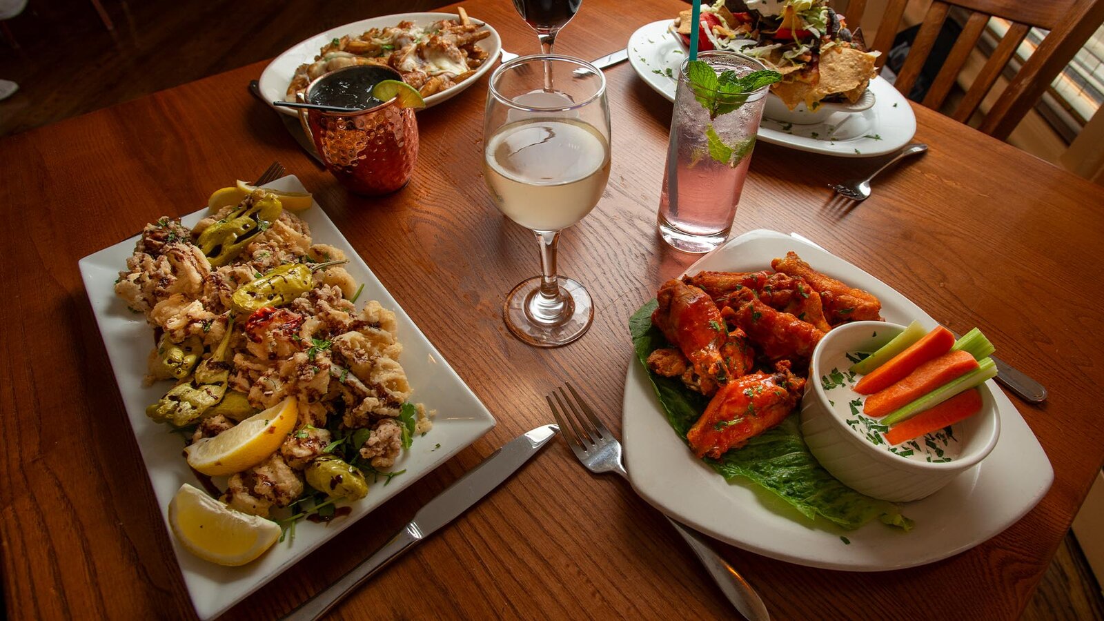 Burger, chicken fingers, mozzarella sticks, french fries, pub cheese, honey mustard
